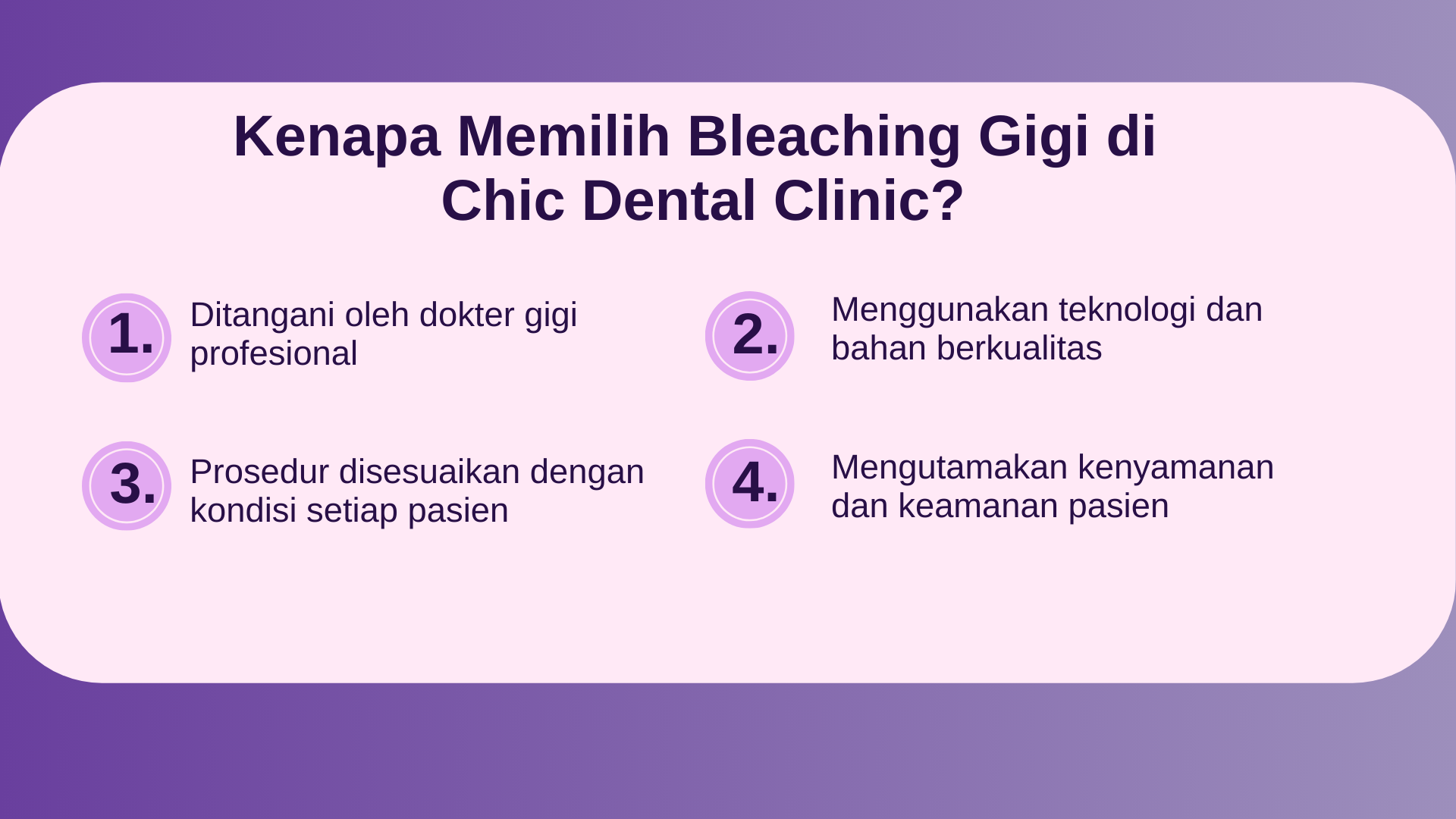 Di Chic Dental Clinic, perawatan bleaching gigi dilakukan dengan metode yang terkontrol untuk membantu menghasilkan warna gigi lebih cerah, natural, dan merata, tanpa merusak struktur gigi.