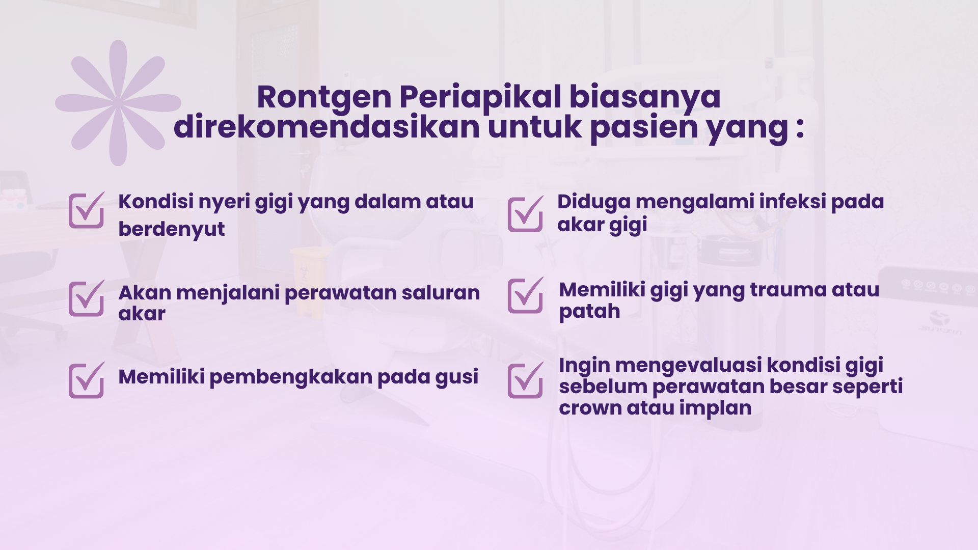 Rontgen Periapikal adalah jenis foto rontgen gigi yang digunakan untuk melihat seluruh struktur gigi secara detail, mulai dari mahkota gigi sampai ke akar dan tulang di sekitar ujung akar. Pemeriksaan ini sangat membantu dokter untuk mengetahui kondisi yang tidak terlihat hanya dari pemeriksaan biasa.