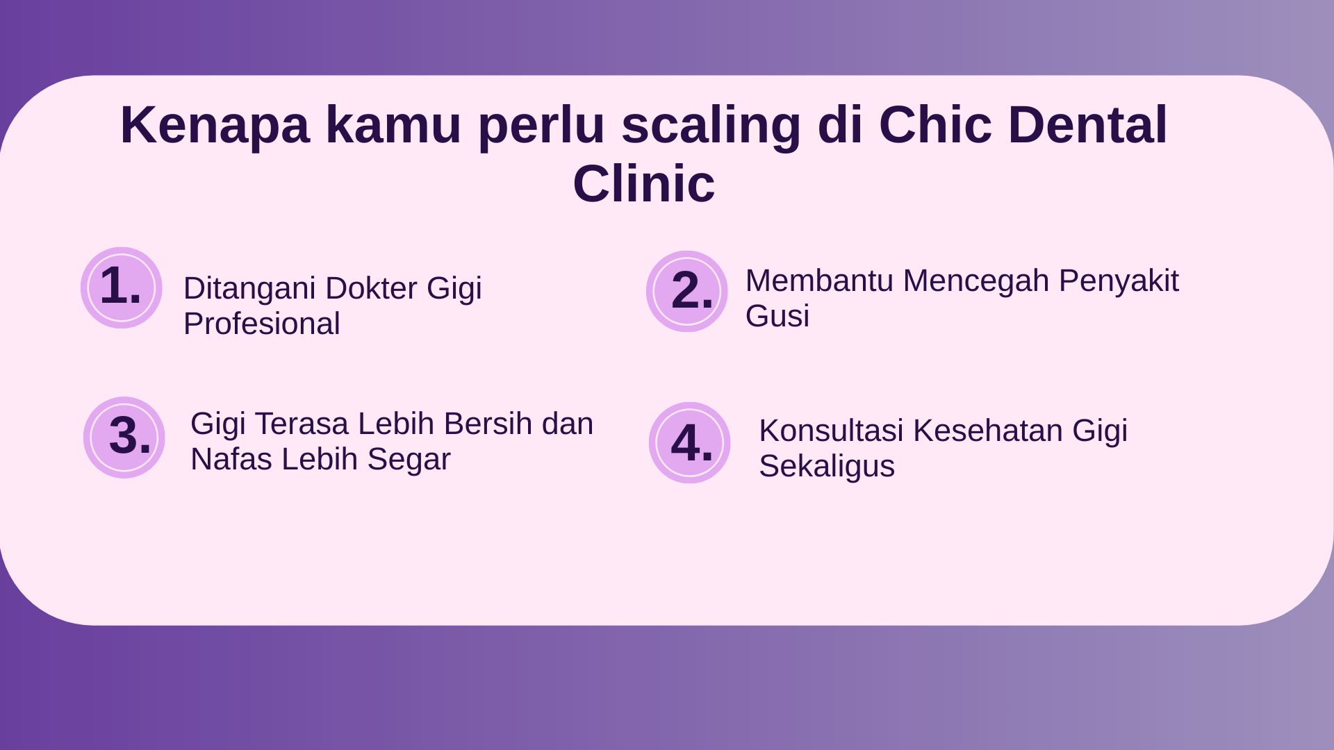 Melakukan scaling gigi secara rutin sangat penting untuk menjaga kesehatan mulut dan mencegah berbagai masalah gigi. Di Chic Dental, perawatan scaling dilakukan dengan prosedur yang aman, nyaman, dan ditangani oleh dokter gigi berpengalaman.
